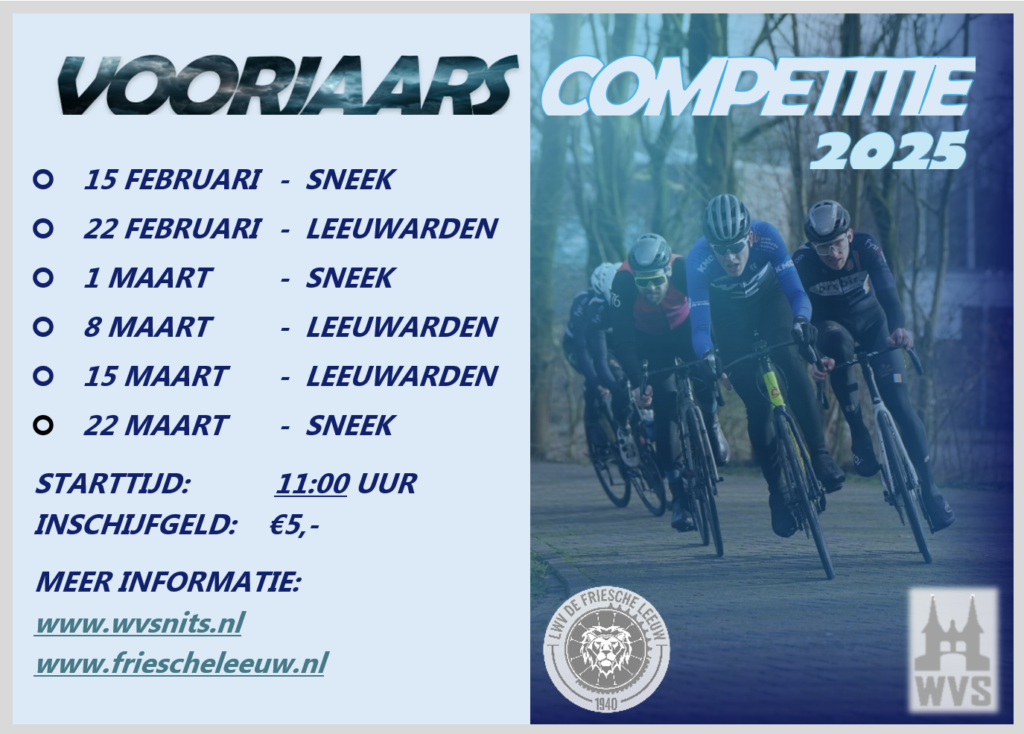 In 2025 organiseren WV Snits en LWV de Friesche Leeuw traditiegetrouw samen weer de voorjaarscompetitie. De wedstrijden worden verreden op zaterdag en beginnen steeds om 11.00 uur.